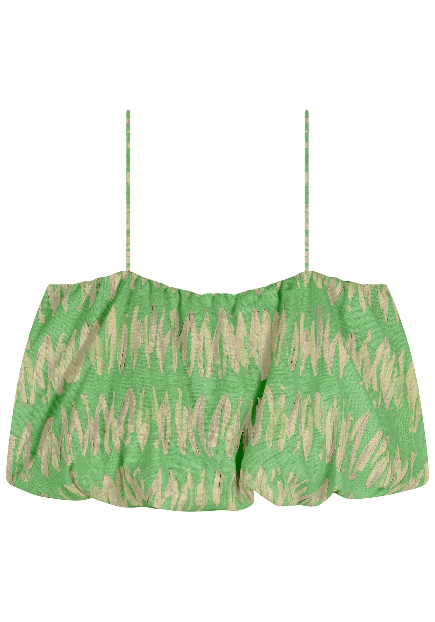 Ce top court imprimé se distingue par sa forme ballon, qui apporte volume et charme à votre look. Ses fines bretelles et la touche en lin en font une pièce polyvalente et élégante. Une valeur sûre pour la saison !