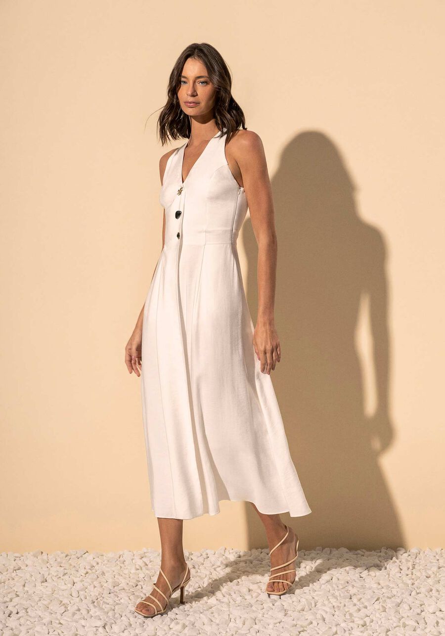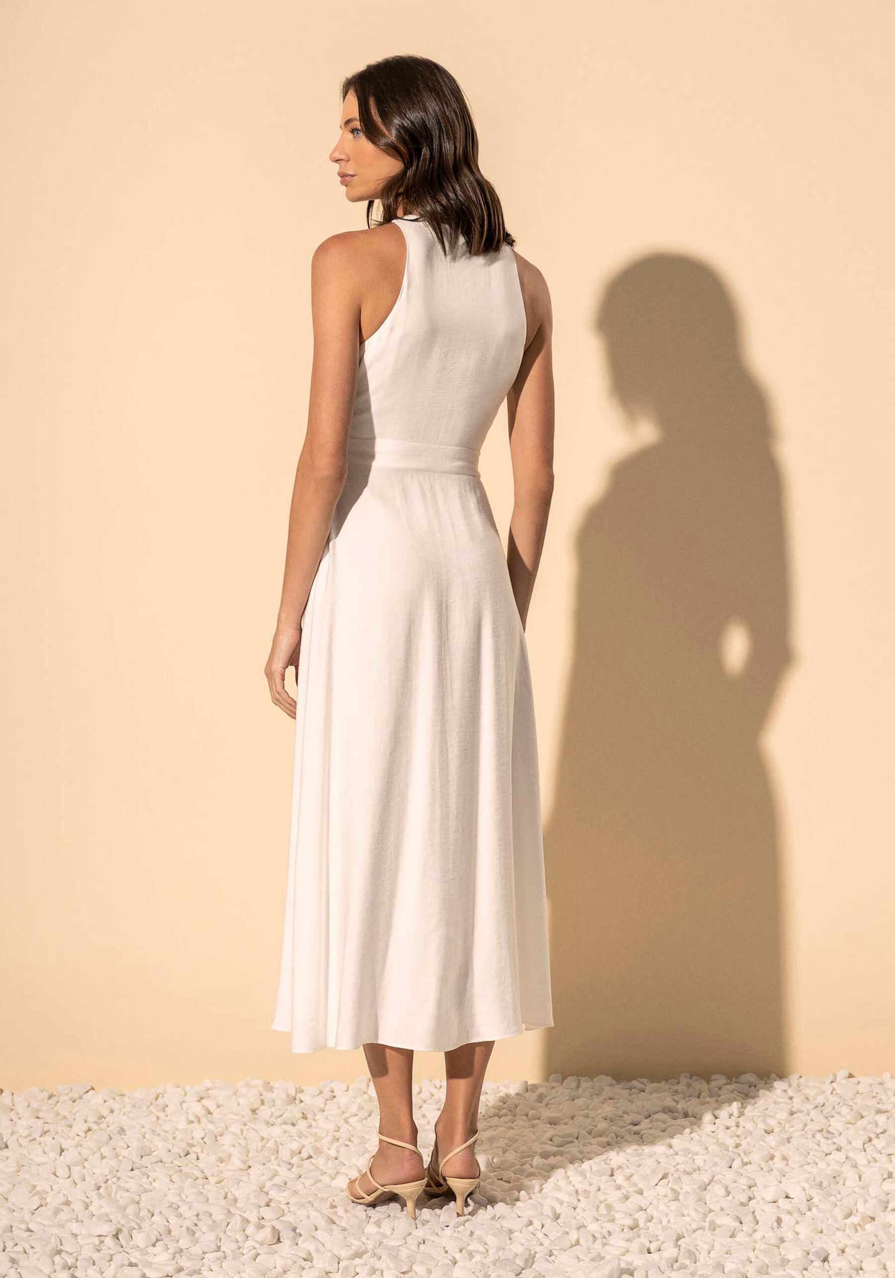 Cette robe en coupe légèrement sergée allie structure et fluidité dans un équilibre parfait. Sa coupe trapèze, ajustée au buste et ample au niveau de la jupe, crée une coupe harmonieuse et intemporelle qui s'adapte à toutes les occasions.