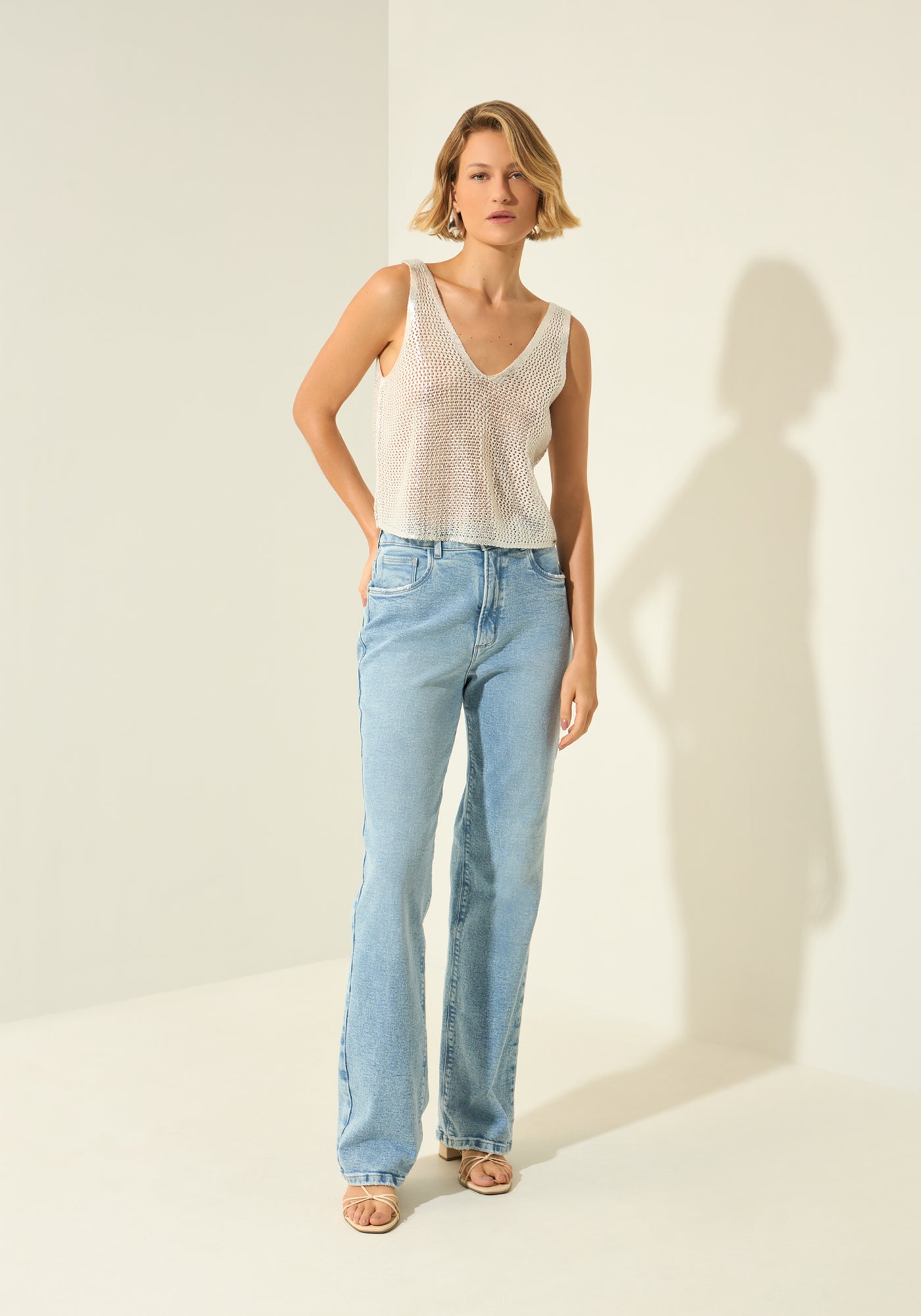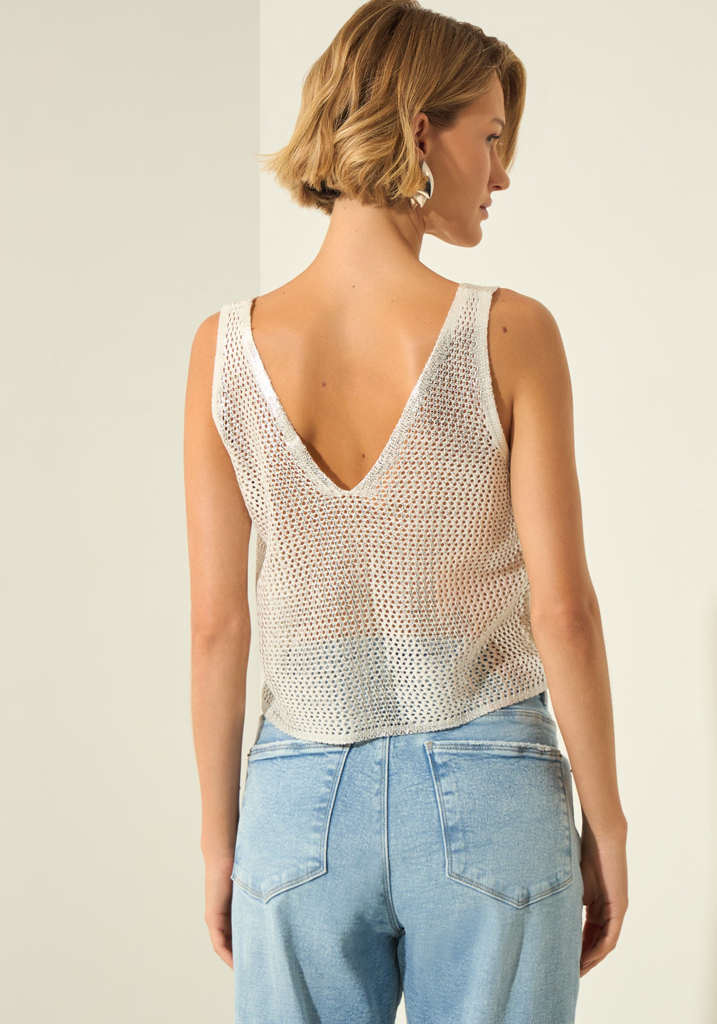 Ce top blanc en maille ajourée délicatement travaillé est sublimé par des accents métallisés qui captent la lumière avec raffinement.