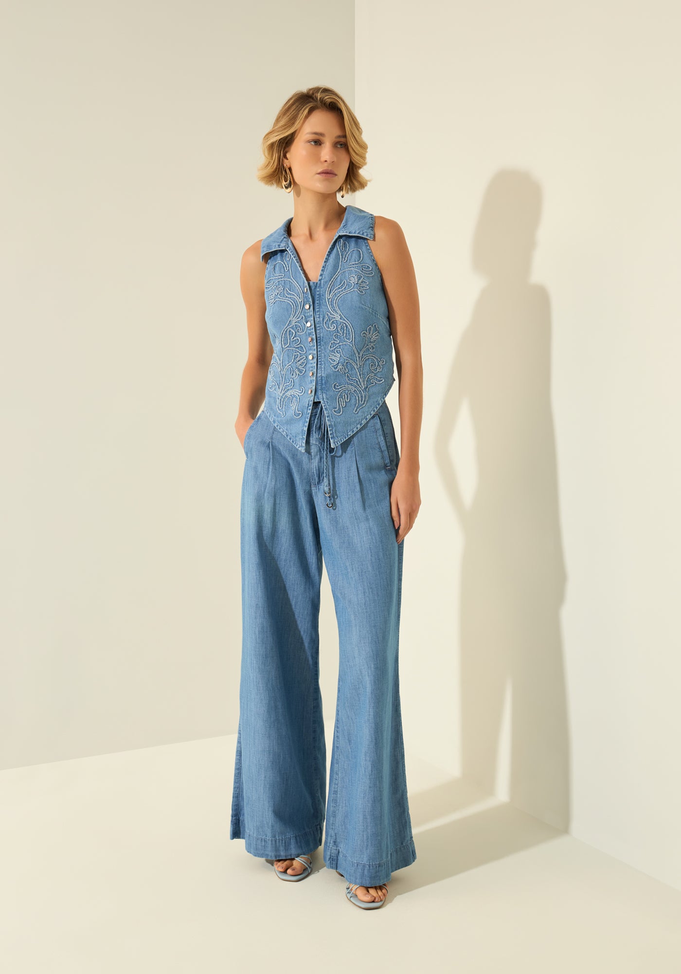 Ce veston en denim marie tradition et contemporanéité avec son tissu jean ultra léger et enrichi de détails brodés artisanaux,