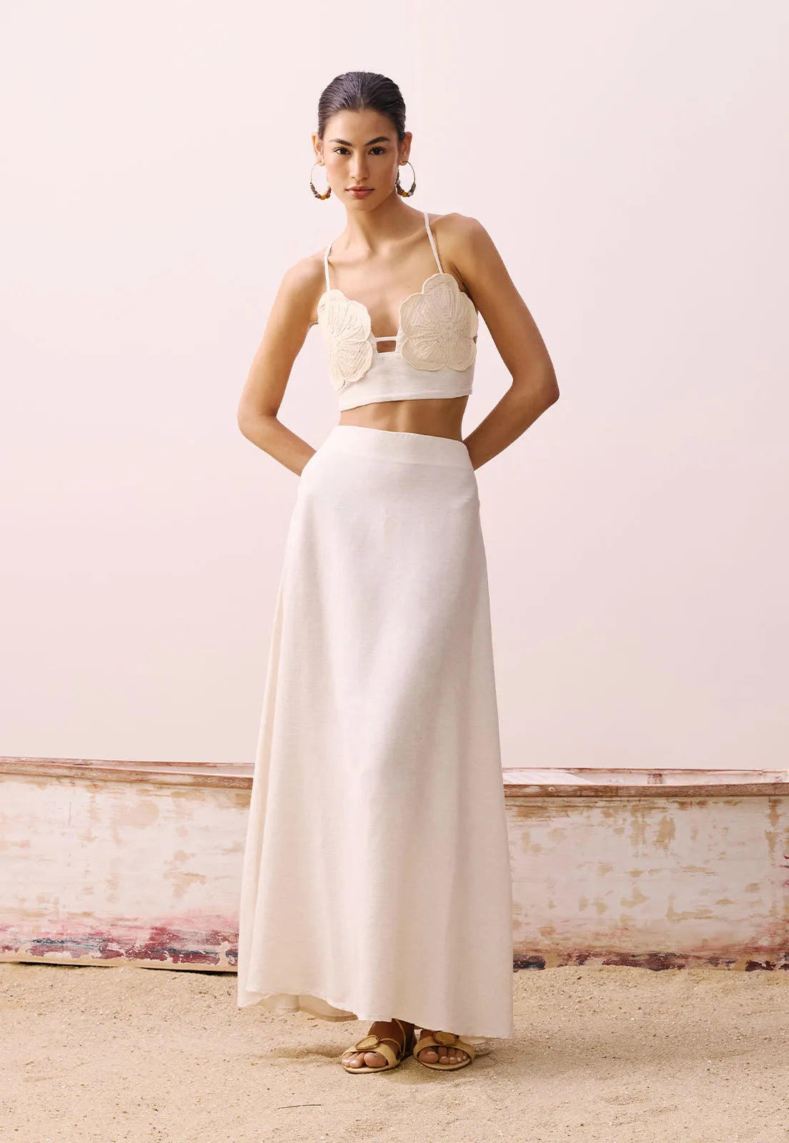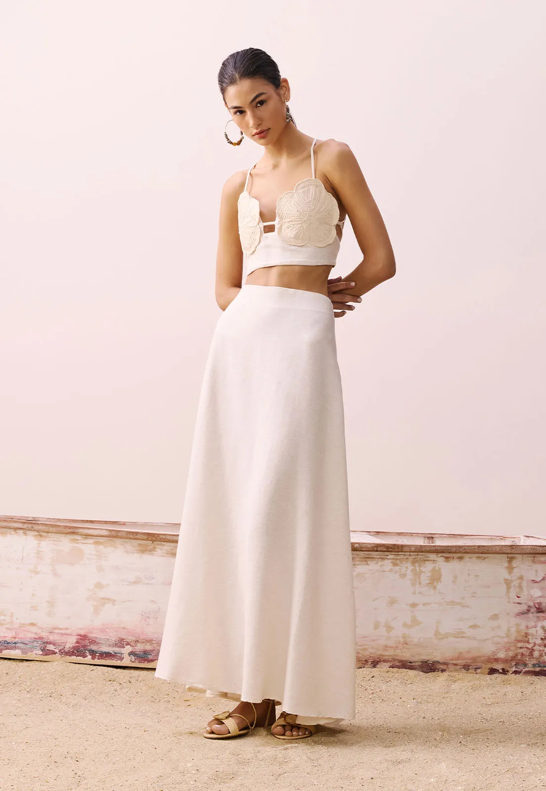 Cette jupe maxi midi incarne à la perfection l'équilibre entre sophistication et légèreté. Avec sa taille haute et sa coupe droite légèrement évasée jusqu'à l'ourlet, cette pièce flatte la silhouette avec une élégance intemporelle.
