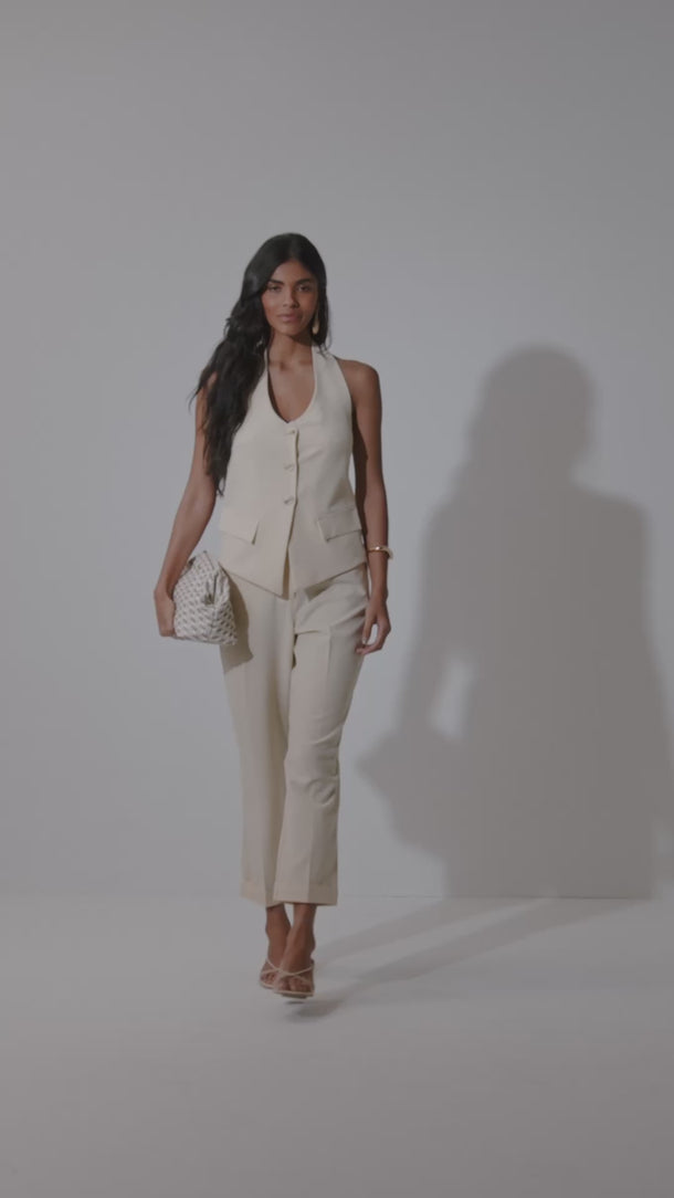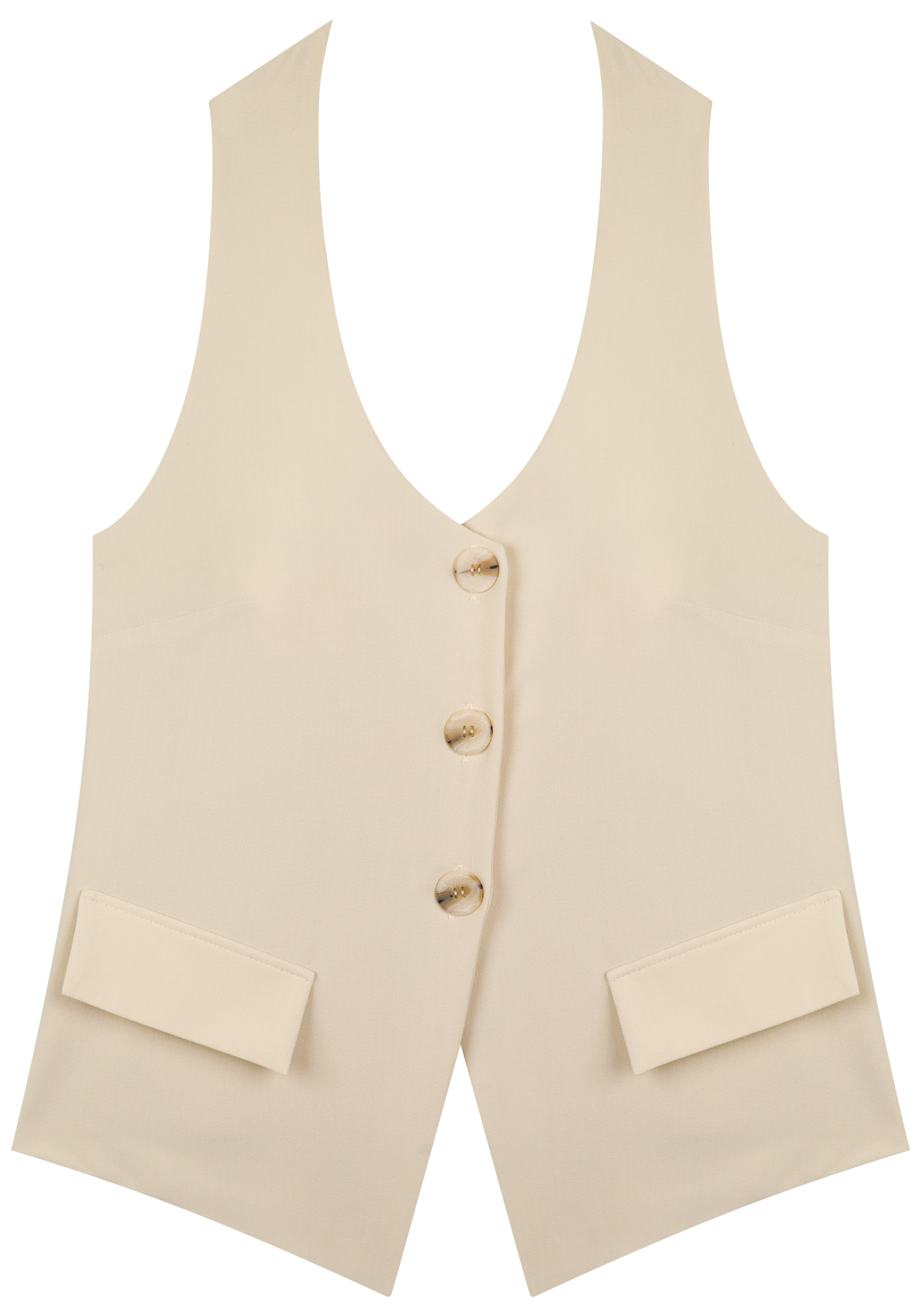 Ce veston cintré de style gilet présente un col halter orné de boutons centraux, pour un look sophistiqué et moderne.