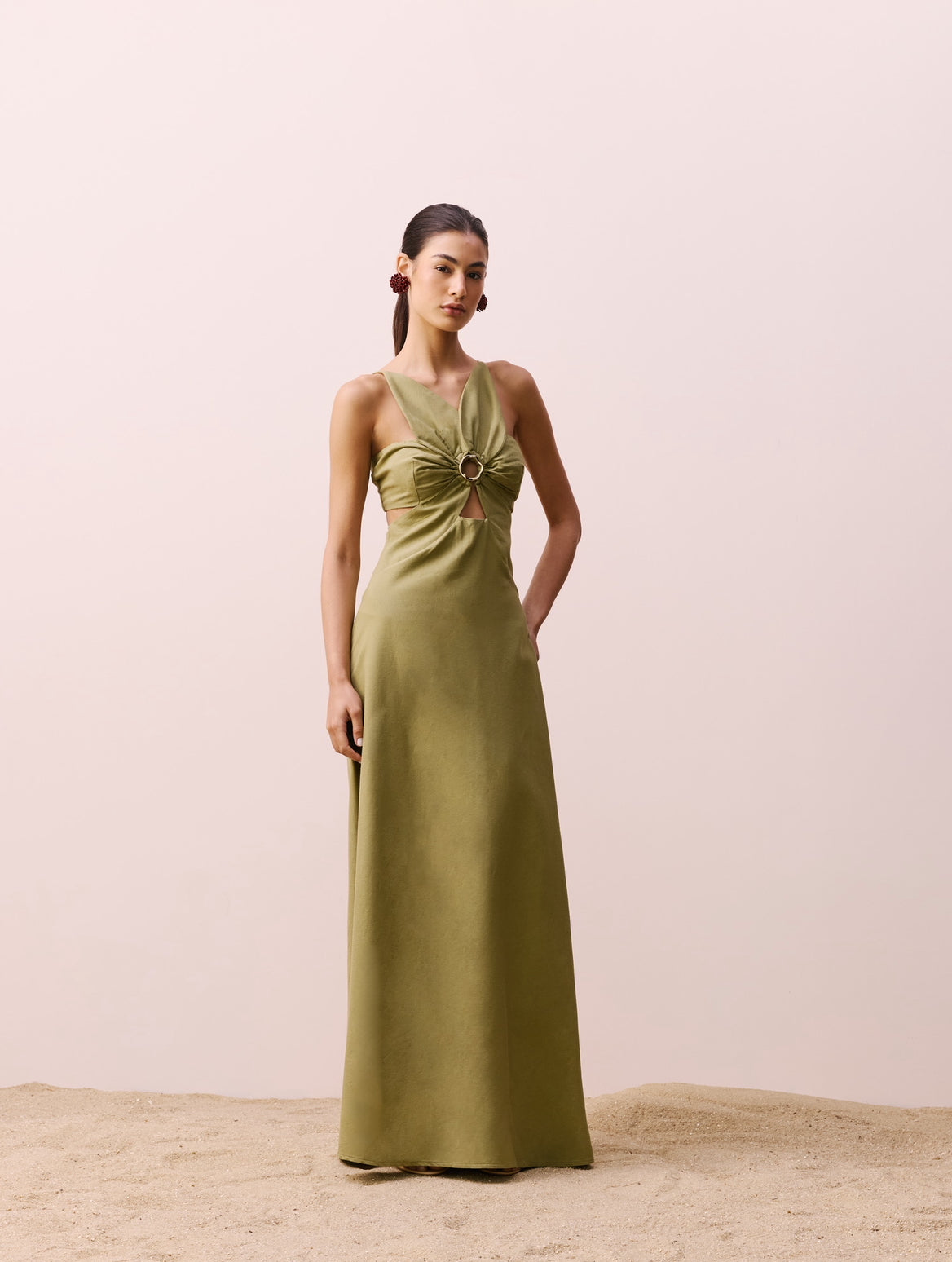 Découvrez l'élégante Robe FEIRA verte, avec sa longueur parfaite et sa coupe ajustée qui met en valeur la poitrine grâce à sa découpe de fleur délicate avec un joli détail doré central . Les pétales en tissu s'enroulent doucement dans votre dos pour un look unique et naturel. Fabriquée avec des matériaux de qualité, cette robe vous offrira un confort inégalé.