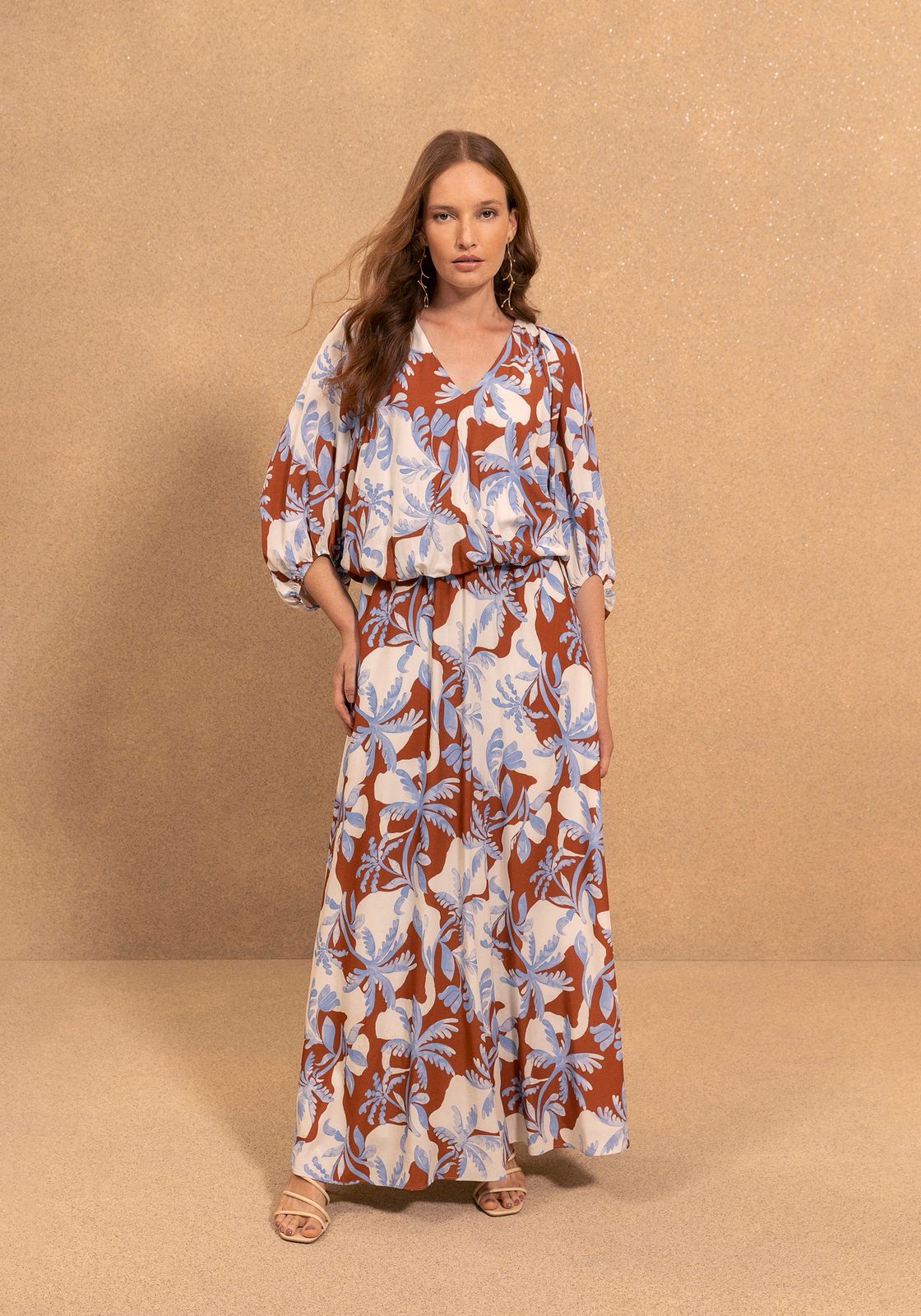 Cette robe longue allie élégance et légèreté grâce à son tissu fluide et son imprimé délicat. Ses manches 7/8 ème apportent une touche raffinée, la taille est élastiquée pour un parfait confort , c'est la robe idéale pour une silhouette féminine et sophistiquée. Parfaite pour les occasions où finesse et confort se conjuguent avec style.
