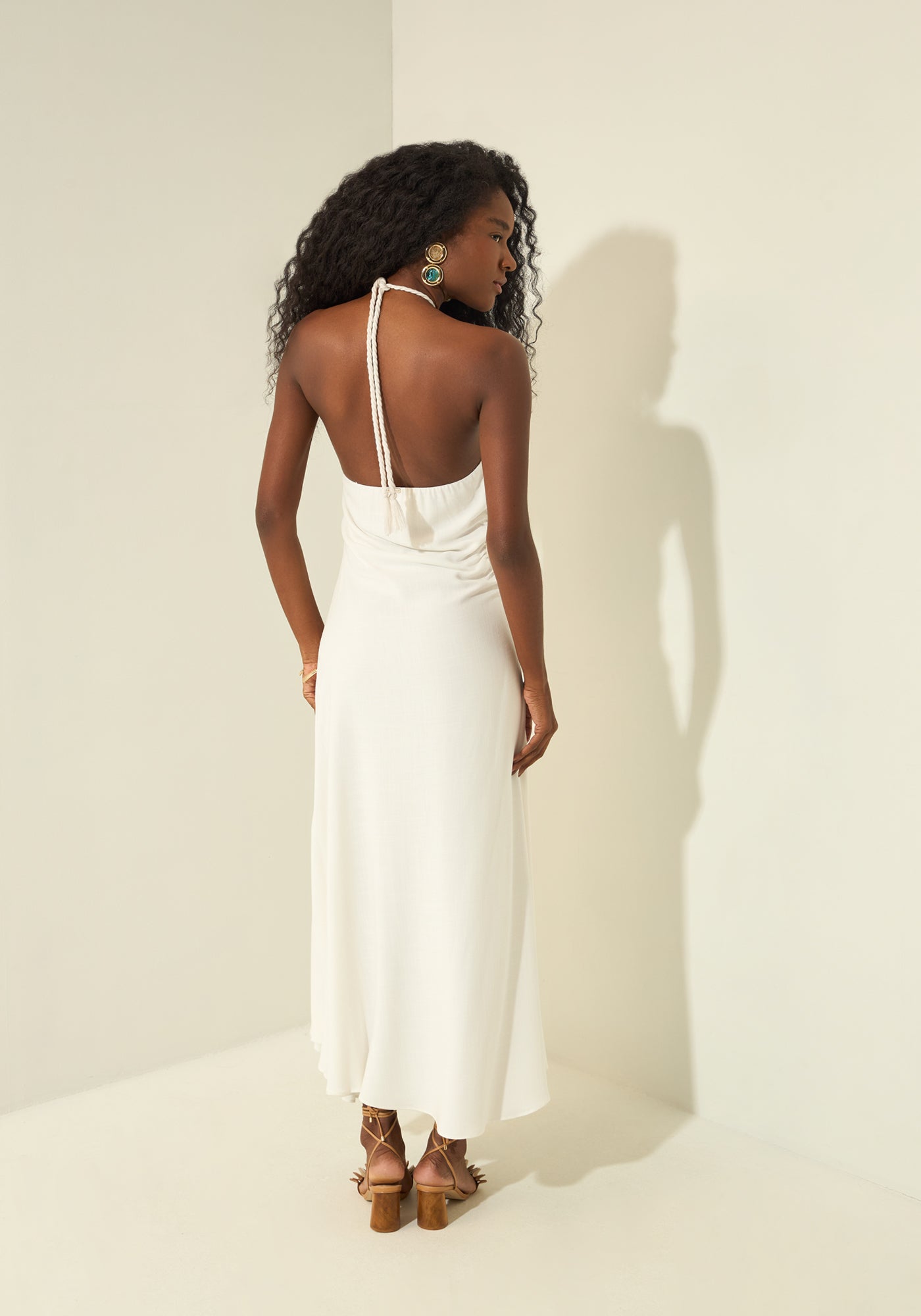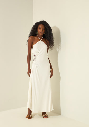tandis que le col halter et les découpes latérales ornées de dentelle créent une silhouette fluide et raffinée.